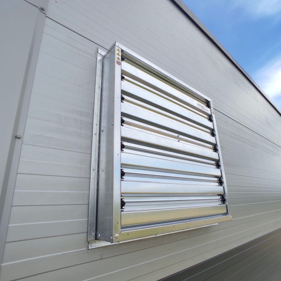 Ein Wandventilator von außen in einem Industriebetrieb zur Belüftung von Produktionsbereichen.