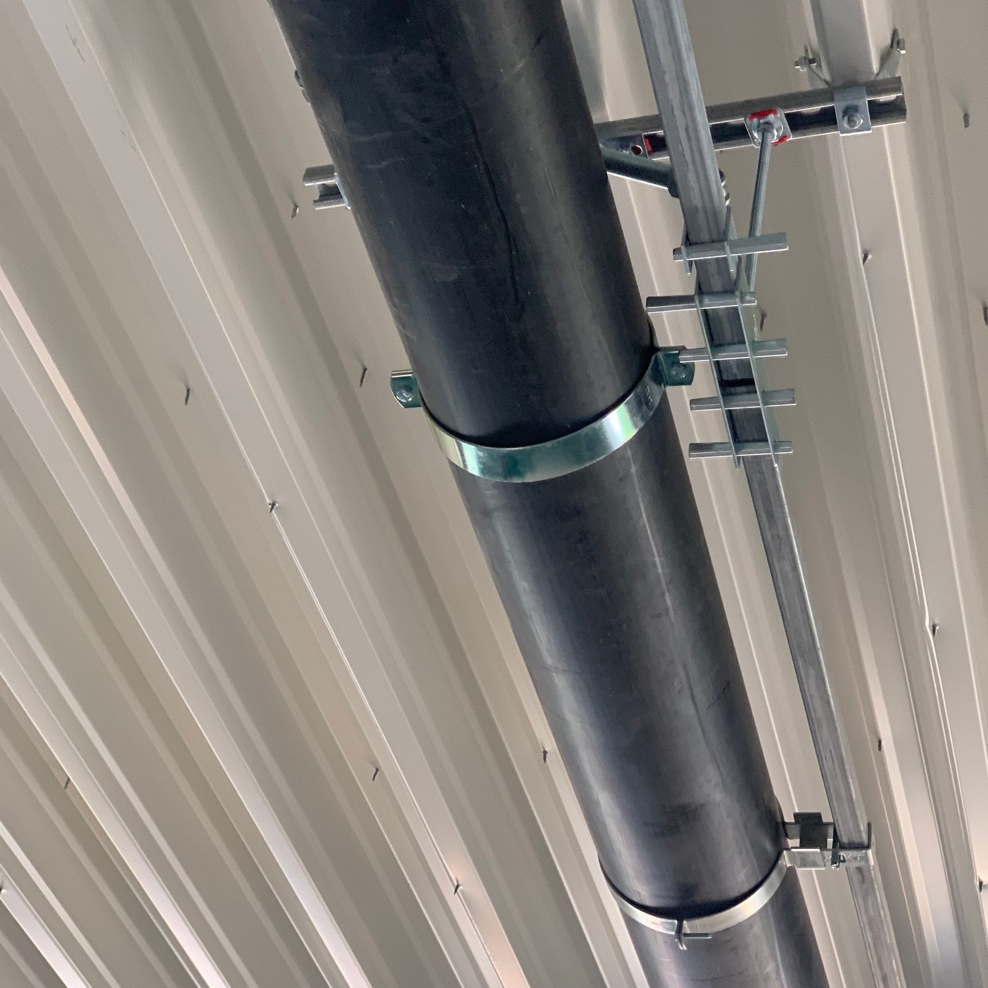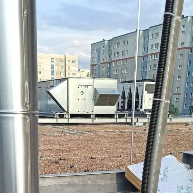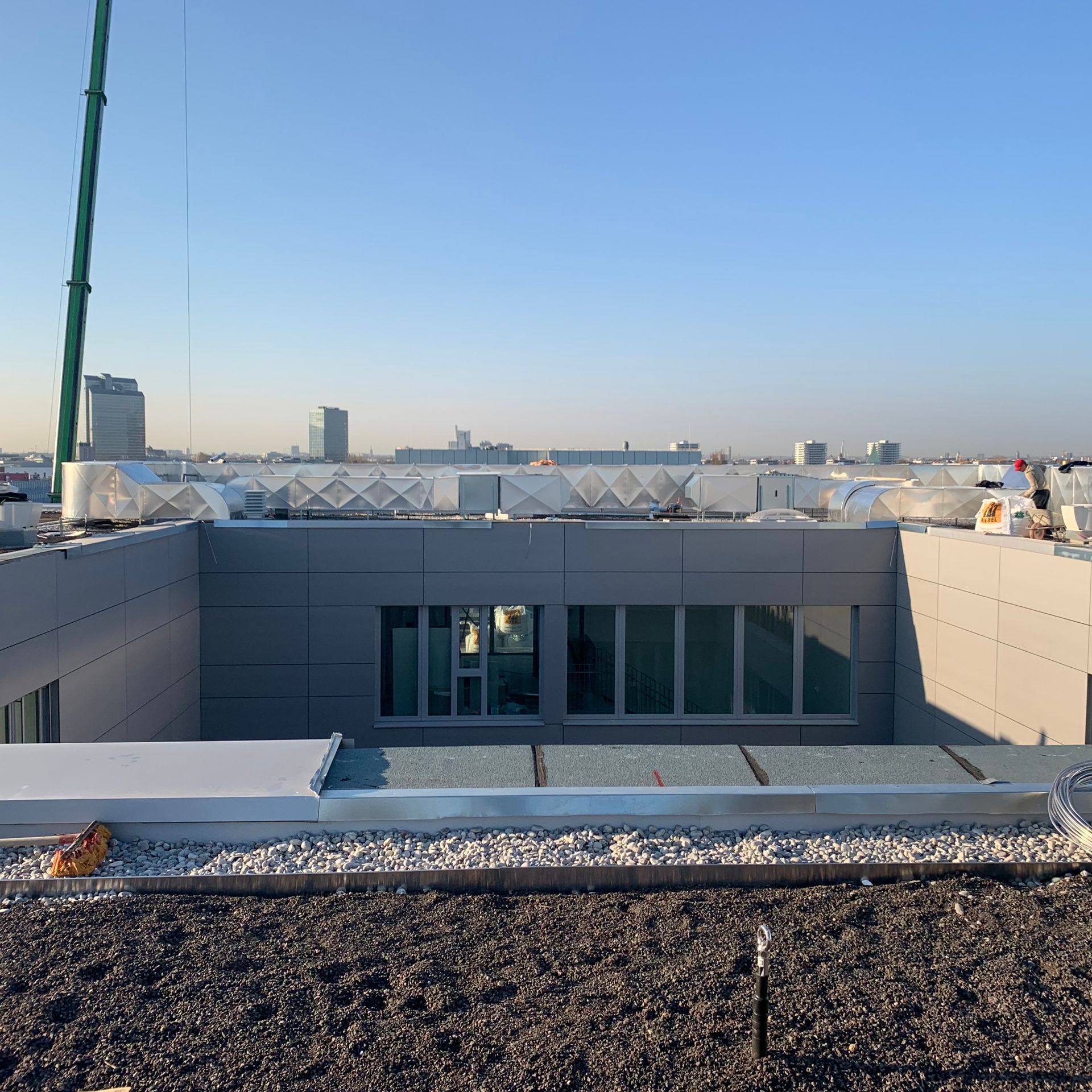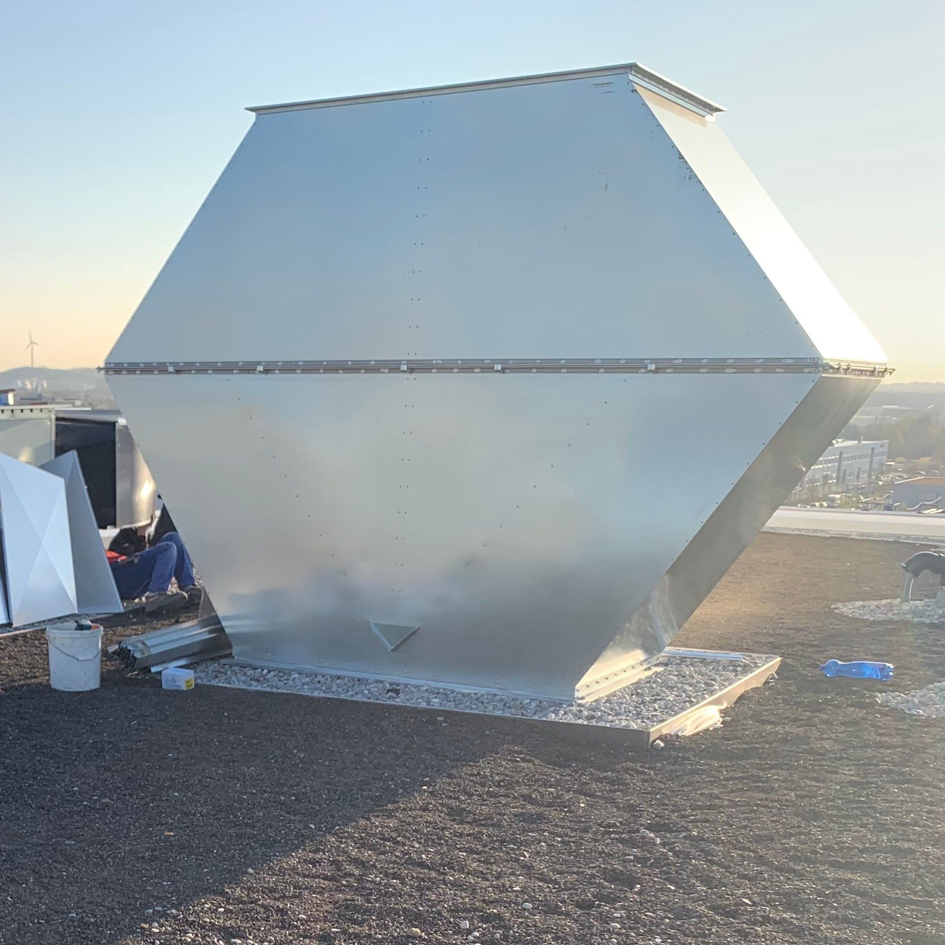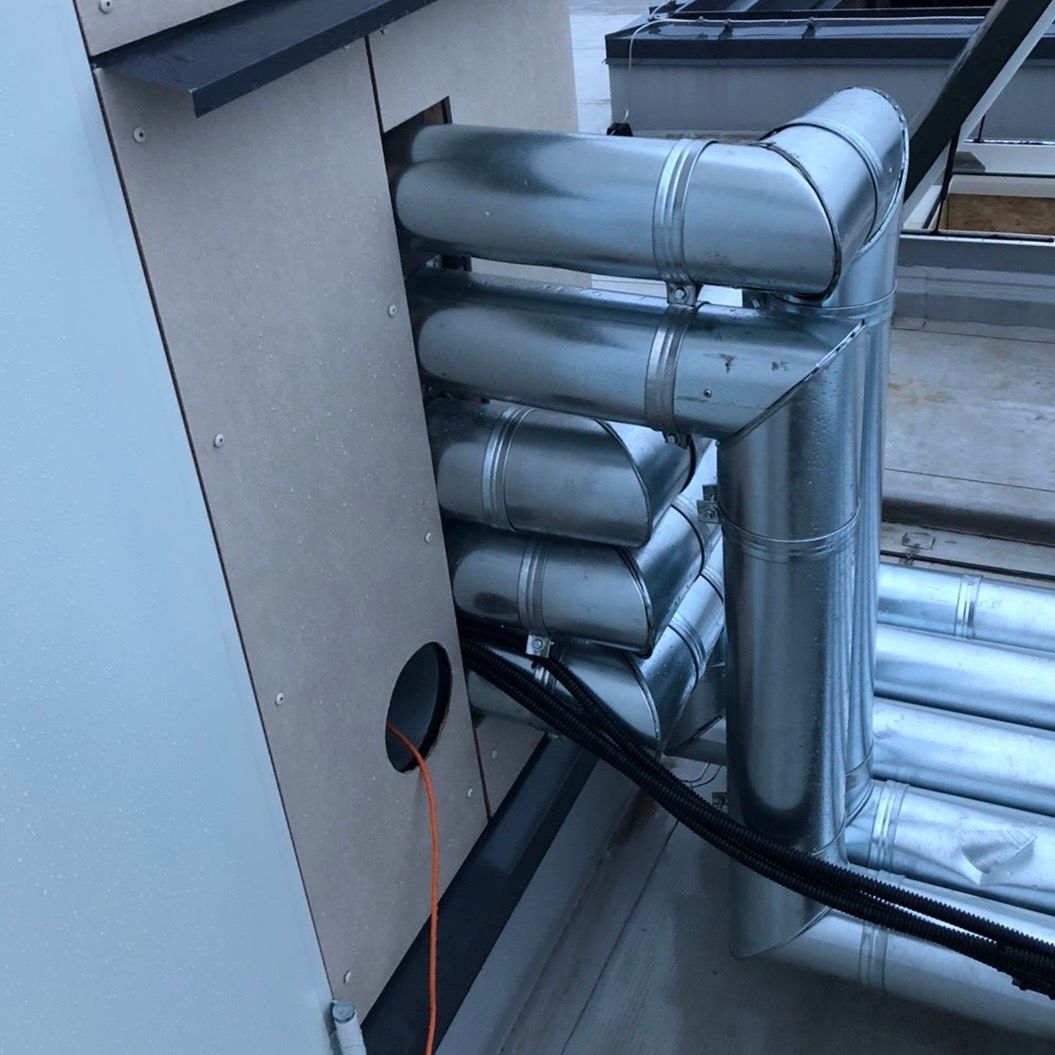 Montage von Lüftungskanälen auf dem Dach eines Bürogebäudes