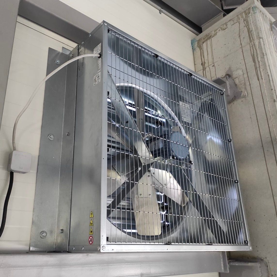 Ein Wandventilator von innen in einem Industriebetrieb zur Belüftung von Produktionsbereichen.